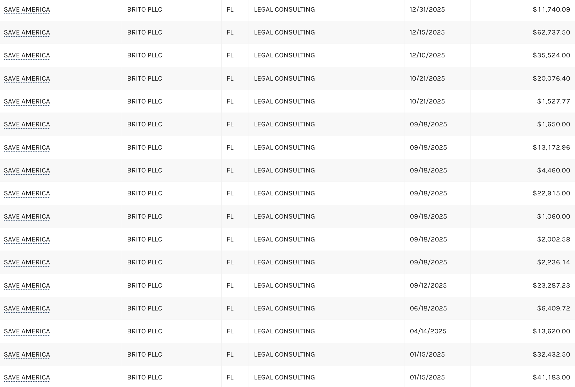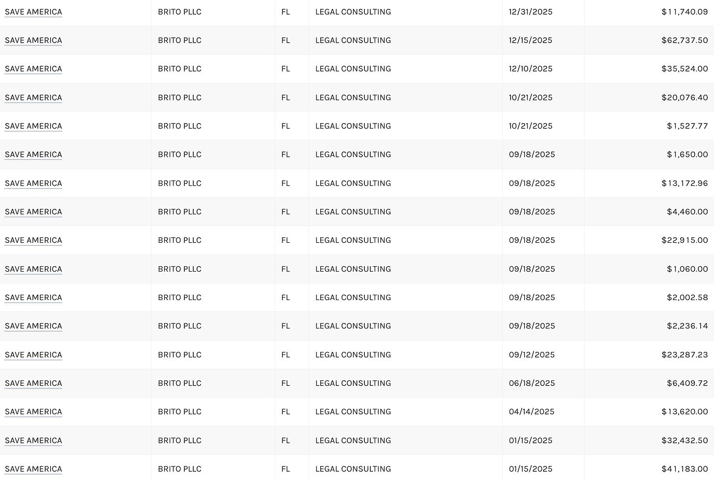 With Trump back in the White House, the focus appears to be more on leveraging the power of the presidency to extort settlements rather than rallying the base. But he’s still tapping donor cash to fund his litigation. Trump’s Save America leadership PAC paid Brito PLLC nearly $300,000 in 2025 alone, logged as “legal consulting.” Brito’s firm also picked up $1 million in fees from the settlement with ABC.