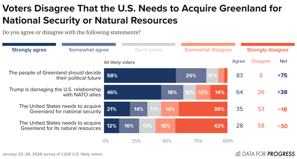 Strong majorities of voters agree that the people of Greenland should decide their political future (83%) and that Trump is damaging the U.S. relationship with NATO allies (64%). Majorities disagree that the U.S. needs to acquire Greenland for natural resources (58%) or for national security (53%).