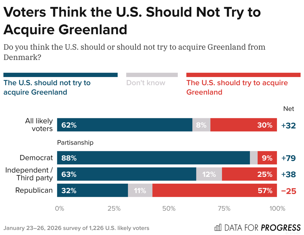 In a new survey, Data for Progress finds that a strong majority of voters (62%) think the U.S. should not try to acquire Greenland, while 30% think it should. Majorities of Democrats (88%) and Independents (63%), as well as about 1 in 3 Republicans, agree the U.S. should not try to acquire the island.