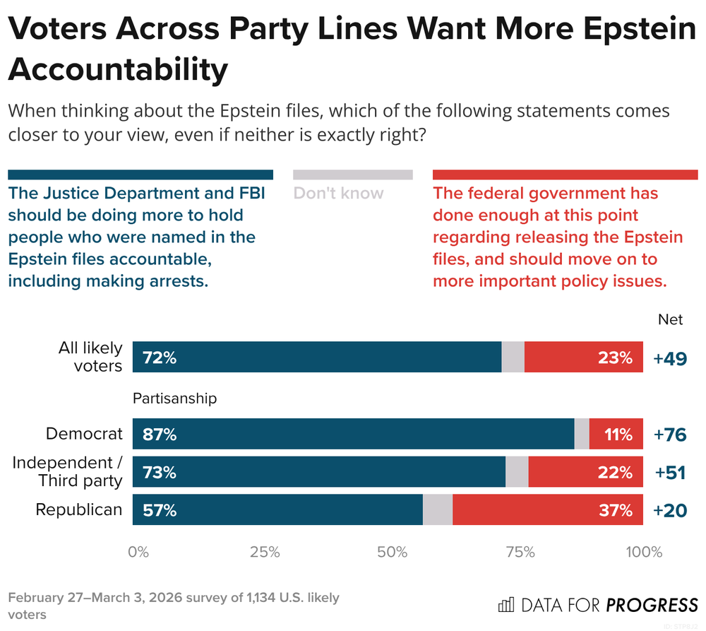 By an overwhelming margin, voters say the Justice Department and FBI should be doing more to hold people named in the Epstein files accountable, including making arrests. Nearly 3 in 4 voters (72%) take this view, compared with just 23% who say the federal government has done enough and should move on.